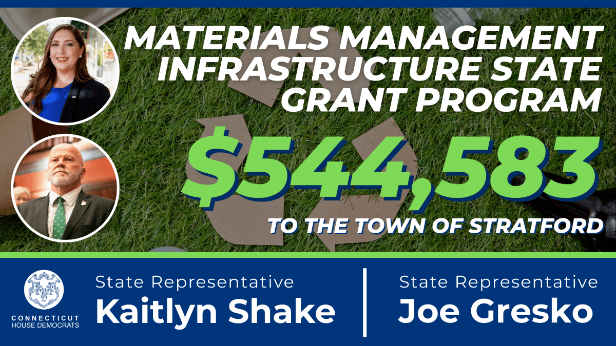 I am pleased to share the Town of Stratford is receiving approximately $545,000 in state grants to reduce our municipal waste disposal costs and protect our environment. The funds, which I strongly advocated for, will help our community develop waste management infrastructure to help divert valuable recyclable and compostable material from disposal.