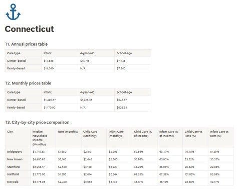 TOOTRiS also researched and published information on the cost of childcare in Connecticut cities, where they claim childcare costs are higher. Our benchmark is Bridgeport.