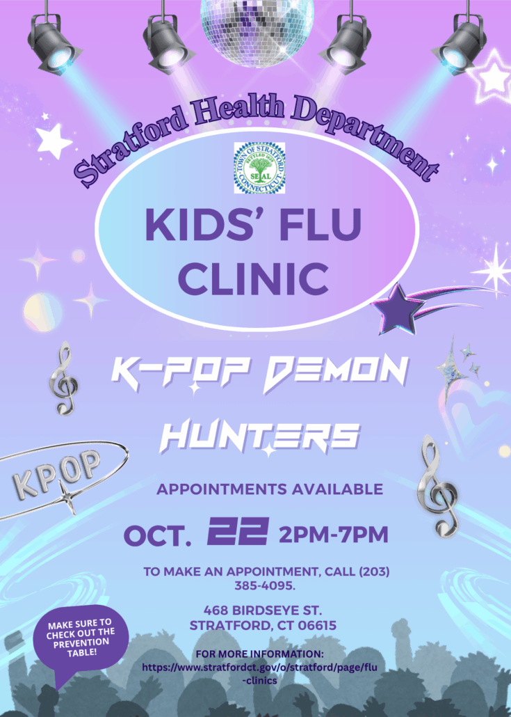 The Stratford Health Department is hosting a K-Pop-inspired Kids’ Flu Clinic on Tuesday, October 22, from 2 PM to 7 PM at 468 Birdseye Street, Stratford, CT. This fun, music-themed event encourages families to get their children vaccinated against the flu in a relaxed, exciting environment. We’ll have themed decorations, giveaways, prevention resources, and a chance for kids to feel like stars while staying healthy this season!