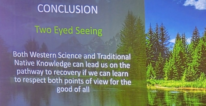Darlene Kascak, of the Schaghticoke Tribal Nation, Education Director and Storyteller at IAIS, captivated the audience by relating Western vs Indigenous views in nature. She noted that Western peoples view the world as commodity-based – Wants vs Needs.