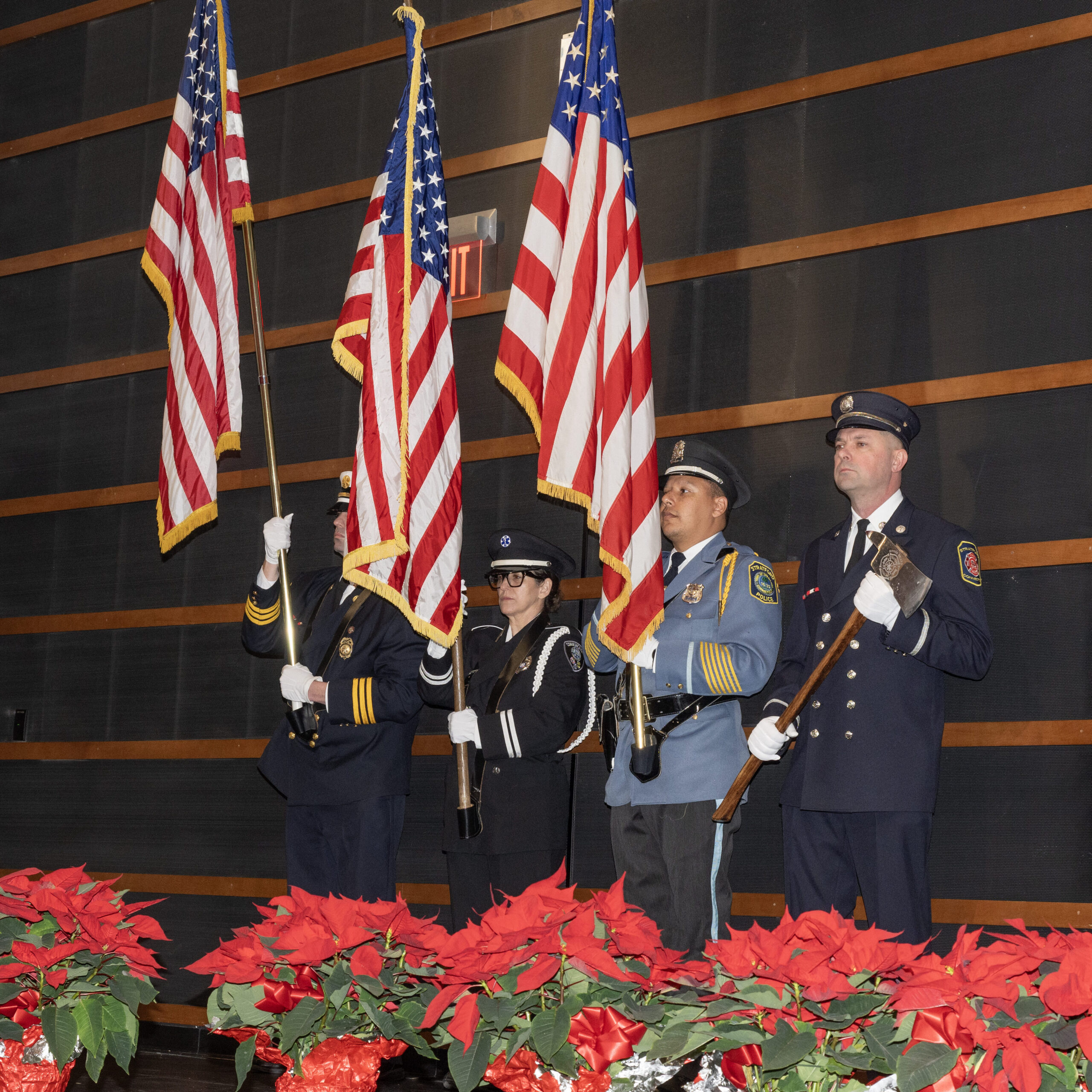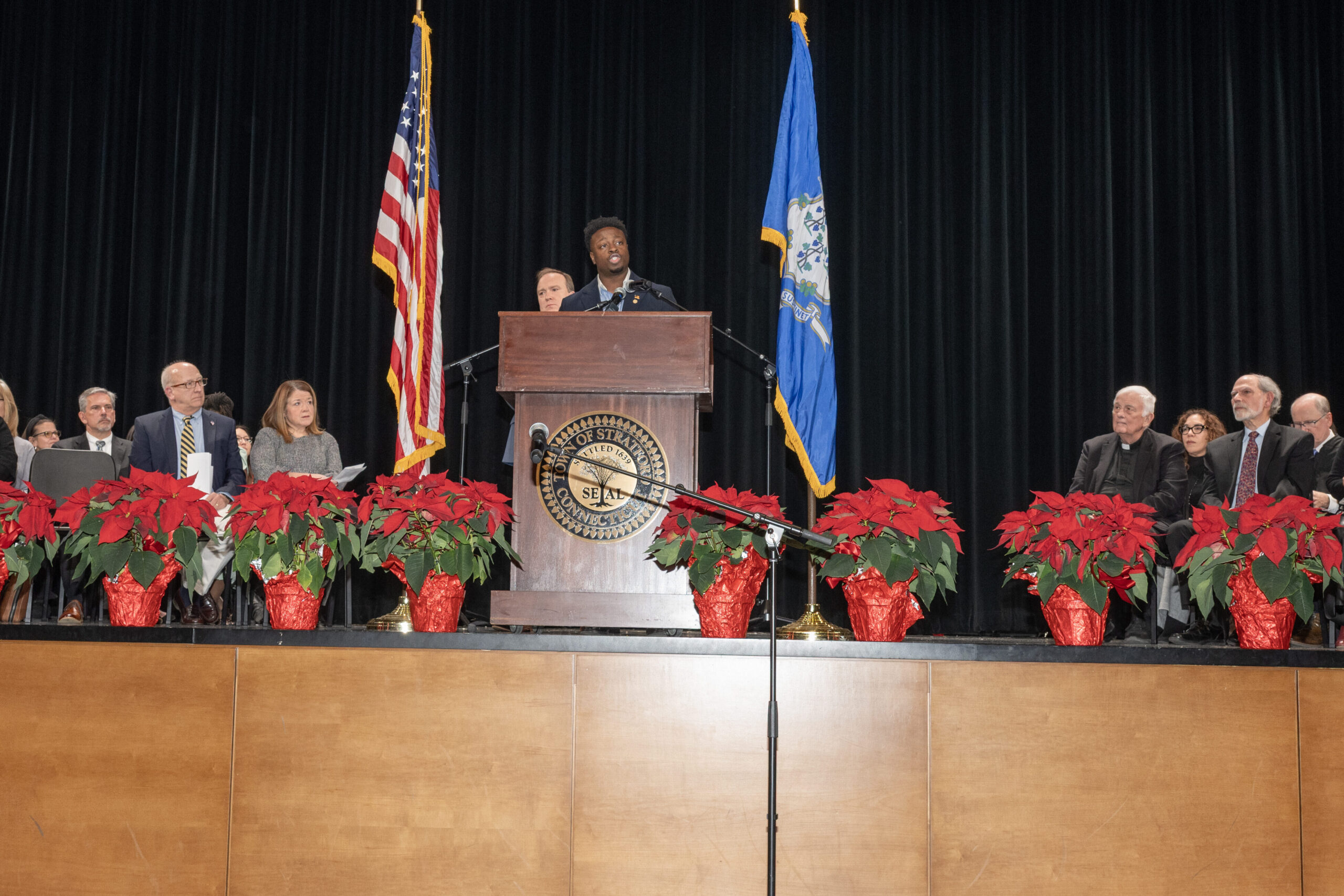 During the ceremony, which began at 6:30 pm, many faces took to the stage to welcome in our new leaders. From the Stratford Firefighter Bagpipers and the Stratford Fire, Police, and EMS Color Guards to the Franklin School students who led us in the Pledge of Allegiance. There was a beautiful rendition of the National Anthem by Evelyn Cade, a Bunnell High School senior, and Knoxroy Rhoden, a Stratford High School senior, who gave a heartfelt interpretation of God Bless America.