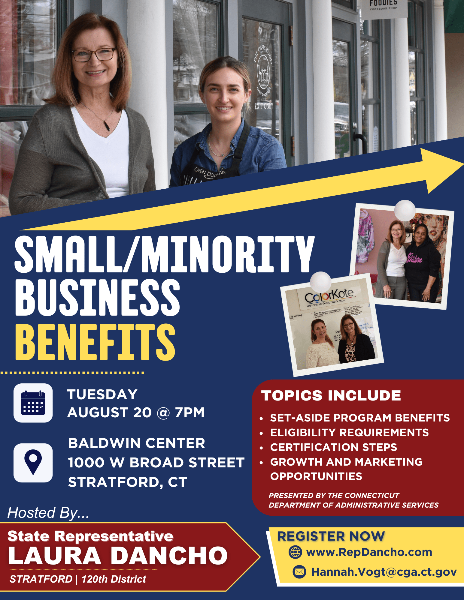 Stratford State Representative Laura Dancho will host a Small & Minority-Owned Business Benefits Forum presented by the Connecticut Department of Administrative Services.