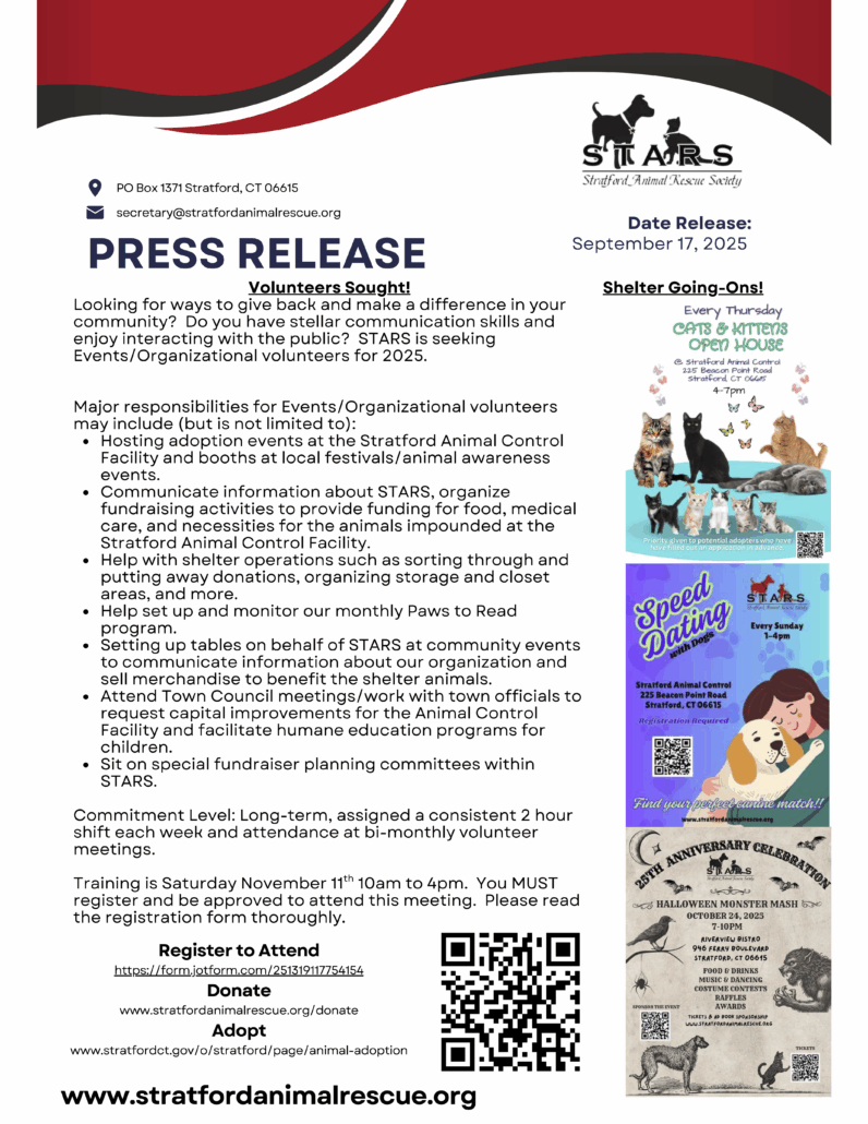 Stratford Animal Rescue Volunteers and Donations Sought