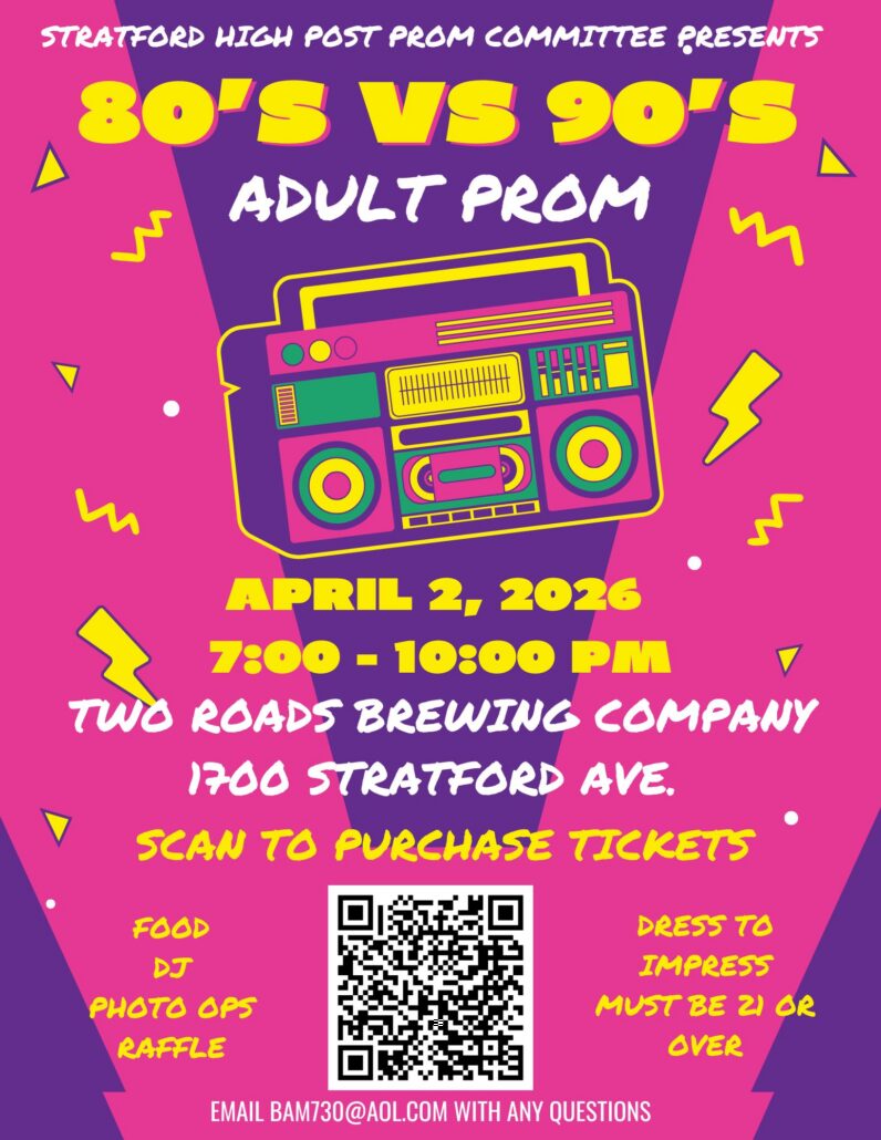 In an effort to fund a safe and supervised post prom celebration for the Class of 2026, the committee is hosting an Adult Prom on Thursday, April 2nd at Two Roads Brewing Company, 1700 Stratford Ave. Doors open at 7:00 p.m. and the event runs through 10:00 p.m. Admission is restricted to guests 21 and older.