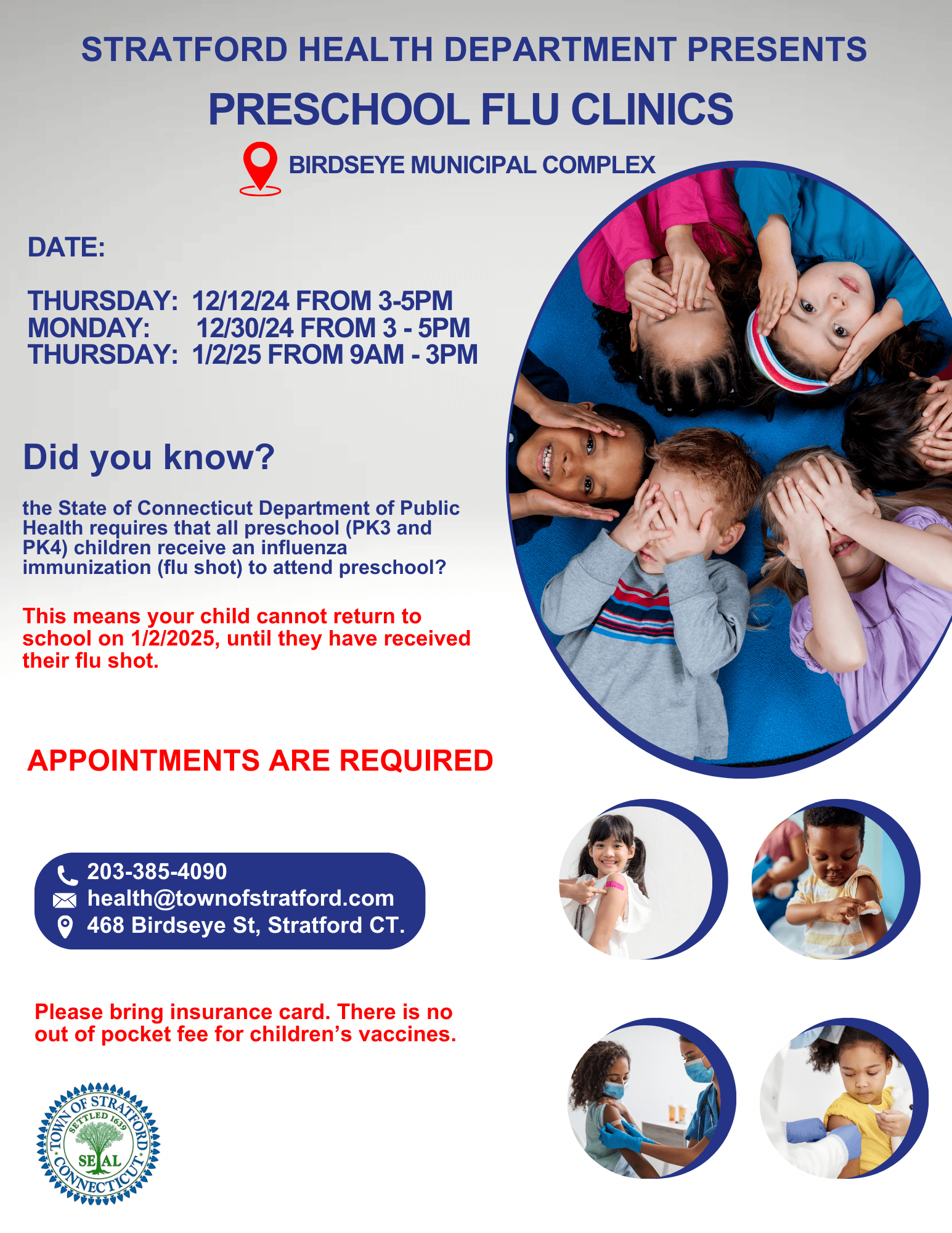 The Stratford Health Department is offering special flu clinics for preschool-aged children to assist families in meeting the Connecticut Department of Public Health’s influenza immunization requirement. The clinics will be held at the Stratford Health Department on the following dates: