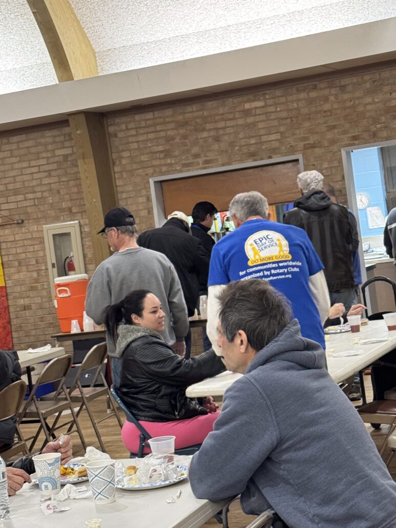 Believing that everyone deserves a hot meal, on Wednesday, December 17th, the club served over 100 meals of: lemon chicken, Haricots Verts (green beans) with carrots, roasted potatoes with rosemary and thyme, and Christmas cookies. The meal was also supported by a local bakery, Icing on the Cake, which donated an assortment of breads. Guests were encouraged to ask for “to go” dinners once everyone had been served a sit-down meal. The chef for the event was Town Councilman Phil Young.