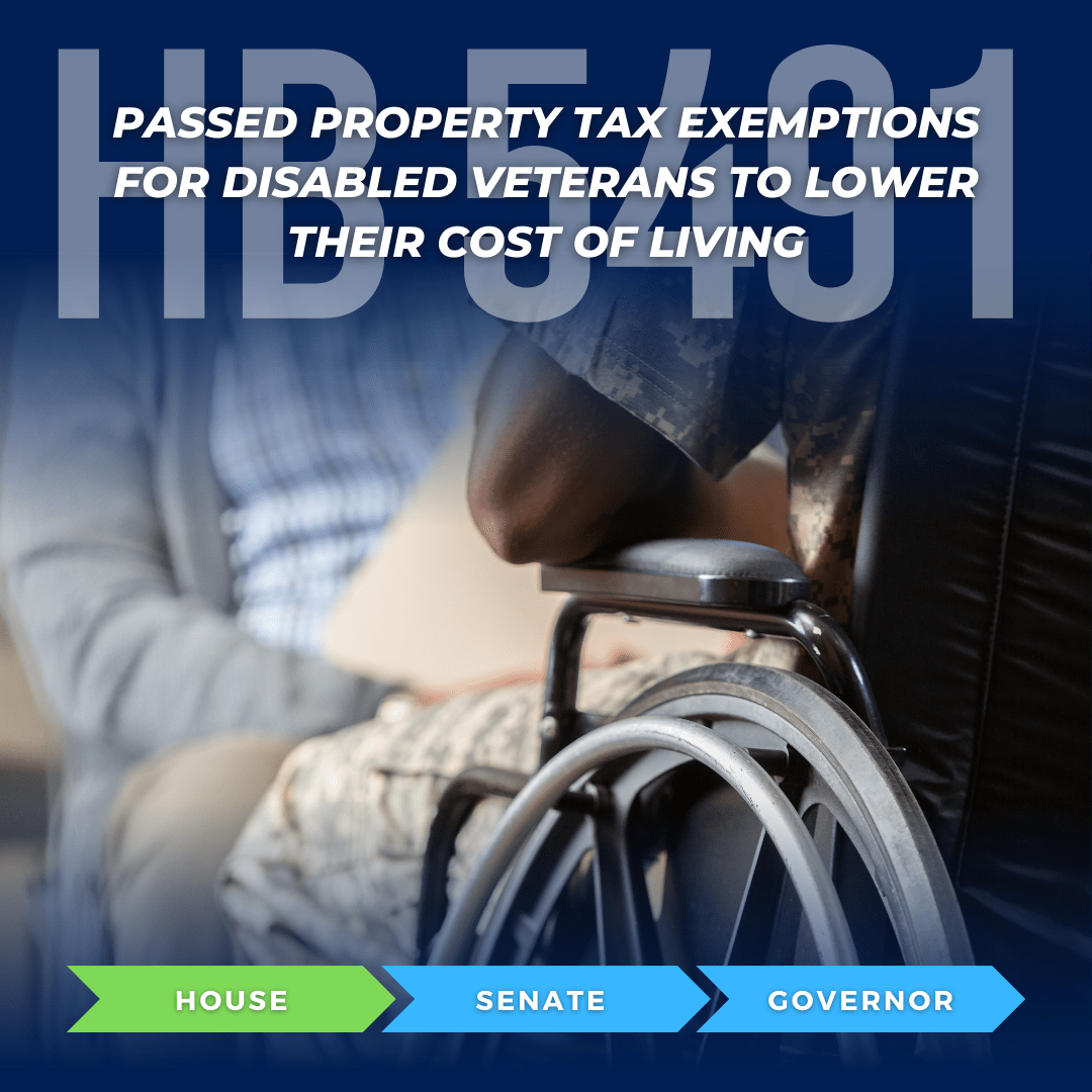 HB 5491 establishes a property tax exemption for veterans who have a service-connected permanent and total disability rating as determined by the United States Department of Veterans Affairs. The exemption will be used for a home that is a primary residence, but if a qualified veteran does not own a home, the exemption will apply to a single motor vehicle that they own.