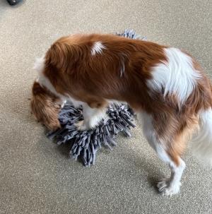 One of the lessons in the Pupster Academy class is Nosework: the trainers hide treats in a “snuffle mat” and the puppies have to sniff the mat until they find the treat.