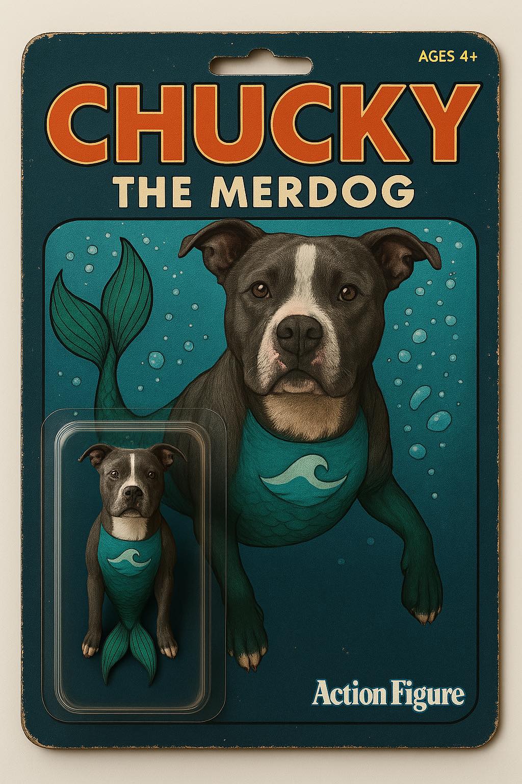 But fate had a shocking twist! A lightning strike transformed him, giving him a shimmering tail and a mission. He became Chucky the Merdog, protector of the seas!