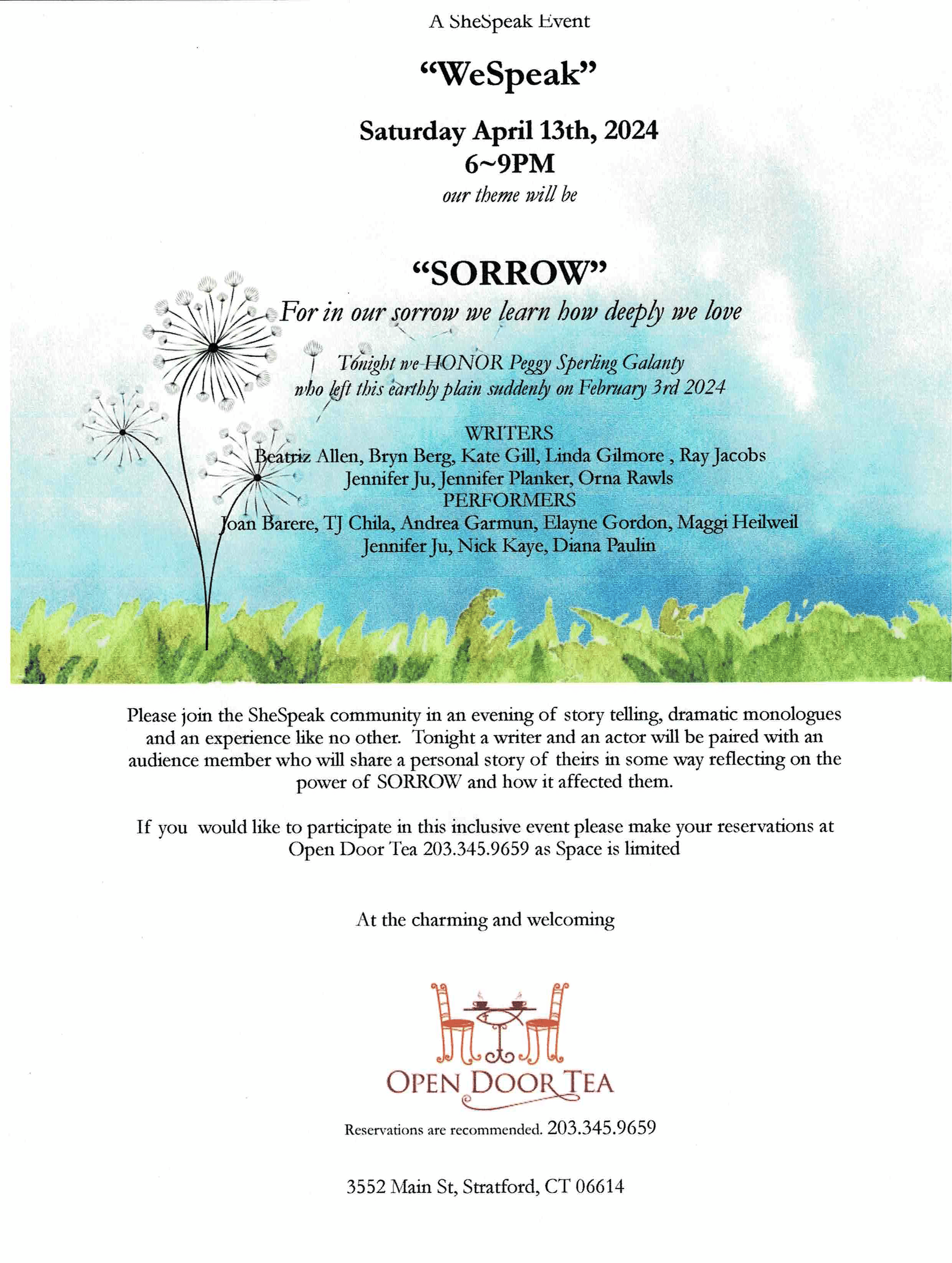 SheSpeak, and now WeSpeak, is a circle of creative women and now men from Connecticut. Our “Live Storytelling Event” is an innovative program designed to bring audience, writer and performer together.